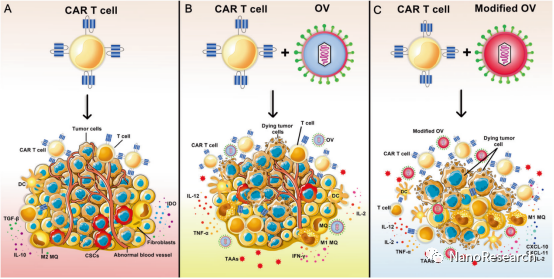 此外,长时间以来免疫激活能力不足是阻碍单纯溶瘤病毒免疫疗法发展的重要原因。临床数据显示将溶瘤病毒免疫疗法与其他癌症疗法联用的临床试验占了很大比例,其中最为成熟的是将溶瘤病毒免疫疗法与化疗联用的治疗模型。而近年来随着CAR-T疗法蓬勃发展,将溶瘤病毒免疫疗法融入包括CAR-T疗法在内的其他免疫疗法的临床及临床前研究备受关注:如用共表达GM-CSF和PD-L1阻断剂的工程化牛痘病毒治疗癌症,以及引入溶瘤病毒免疫疗法以解决CAR-T疗法在实体瘤中治疗效果不佳的问题都是很好的联用案例。在临床试验中,无论是作为主药还是免疫佐剂,溶瘤病毒都在其中起到了十分重要的作用。
