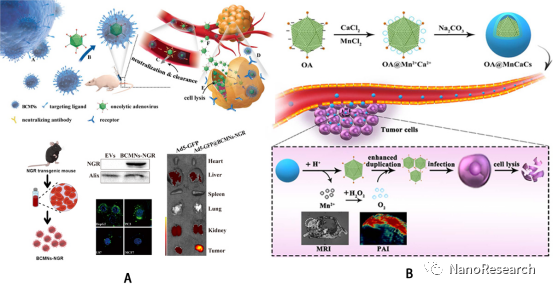 下图展示了两种典型的OVs系统性递送系统。图A的设计思路是分别通过体内体外两种方式用生物工程化细胞膜包被溶瘤病毒以提高OVs的生物相容性;图B则是利用溶瘤腺病毒表面带负电的性质,在其表面矿化上一层无机材料,提高OVs系统性递送效率的同时还改善了肿瘤处的乏氧环境。