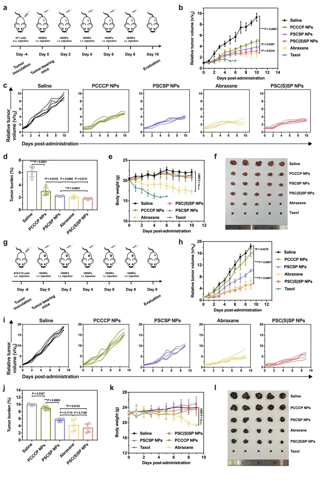 结果表明,由于硫-硫交换反应的发生,三硫键桥连的前药表现出相对较差的化学稳定性。而在三硫键中简单插入中心碳原子可显著增强二聚体前药的化学稳定性和组装稳定性。除了保留硫原子固有的氧化敏感性外,由于亲电中心碳原子的反应性,-SC(S)S-键表现出更高的还原敏感性。此外,通过-SC(S)S-键桥连的前药能够抑制抗氧化防御酶,从而上调细胞内ROS水平并诱导肿瘤细胞凋亡。最终,-SC(S)S-键赋予了HDPNs更长的体内循环时间和更高的肿瘤特异性,与两种临床制剂(Taxol®和Abraxane®)相比增强了治疗效果。