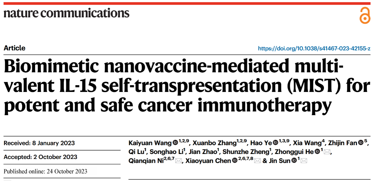 2023年10月24日,欧冠联赛官网孙进教授、何仲贵教授与新加坡国立大学陈小元教授、倪倩倩助理教授合作在Nature Communications杂志在线发表题为“Biomimetic nanovaccine-mediated multivalent IL-15 self-transpresentation (MIST) for potent and safe cancer immunotherapy”的研究论文,开发了仿生纳米疫苗介导多价IL-15自反式呈递,实现了IL-15和肿瘤抗原的时空同步递送,从而有效产生肿瘤特异性细胞毒性T淋巴细胞,用于有效且安全的肿瘤免疫治疗。