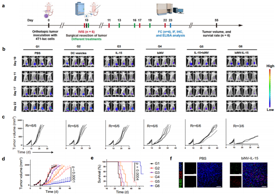 接下来作者考察了biNV-IL-15的体内毒性。将IL-15和biNV-IL-15给予小鼠,在单次治疗剂量超过7.5 μg的情况下四次注射IL-15后观察到显著的体重减轻,最终引起致死的免疫毒性。相比之下,即使在最大可用注射剂量下,biNV-IL-15的治疗也没有出现明显的毒性(图4)。IL-15和肿瘤抗原的时空同步呈递阻止了非特异性全身免疫刺激,从而避免了系统毒副作用。