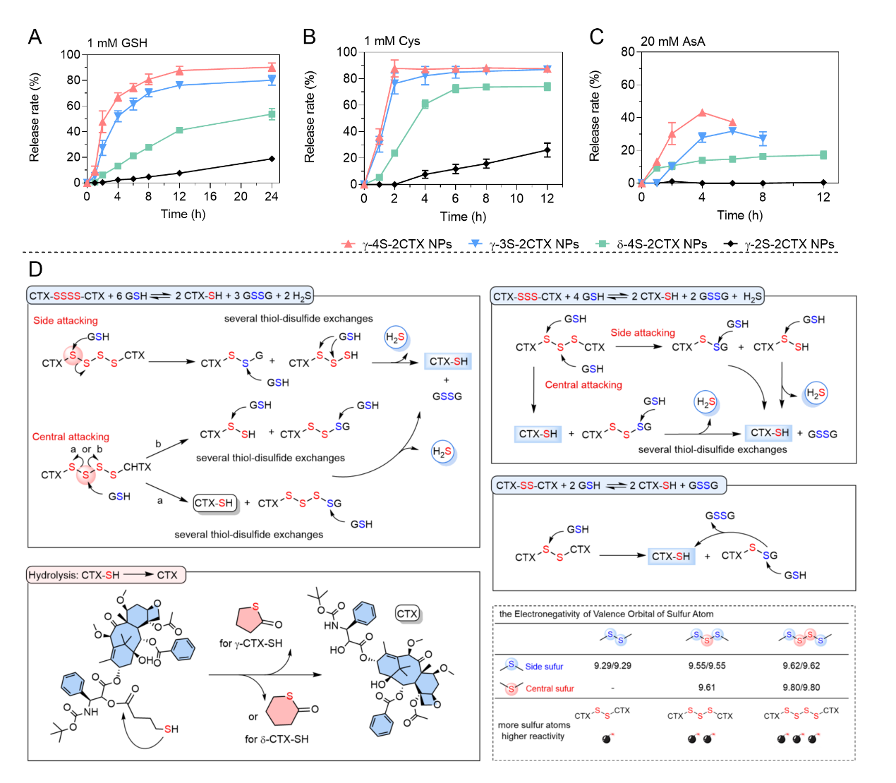 作者接着考察了前药自组装纳米粒的体外释放行为,结果如图3所示。γ-4S-2CTX NPs表现出超高还原反应性,对于多种还原物质(谷胱甘肽GSH、半胱氨酸Cys和抗坏血酸AsA)都具有良好的响应能力。与三硫键/二硫键相比,四硫键超高的还原反应性可归因于以下三点:(1)四硫键的硫原子都表现出较高的价轨道电负性,表明它们非常容易受到GSH的亲核攻击;(2)四硫键具有更多的硫原子,尤其是活性更高中心硫原子;(3)四硫键在还原反应过程中释放更多H2S,从热力学角度该反应更容易进行。