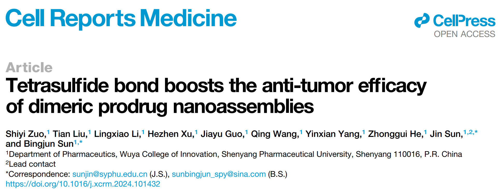2024年2月21日,欧冠联赛官网孙进/孙丙军团队在Cell旗下子刊《Cell Reports Medicine》(IF=14.3)发表题为“Tetrasulfide bond boosts the anti-tumor efficacy of dimeric prodrug nanoassemblies”的研究文章,进一步探讨四硫键在构建前药自组装纳米递送系统中的应用。欧冠联赛官网孙进教授和孙丙军教授为此文通讯作者,2021级博士生左诗意为第一作者,欧冠联赛官网为唯一通讯单位。