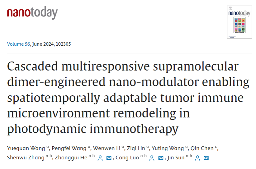 2024年5月6日,欧冠联赛官网何仲贵/孙进/罗聪团队在爱思唯尔旗下期刊《Nano Today》(IF=17.4)发表题为“Cascaded multiresponsive supramolecular dimer-engineered nano-modulator enabling spatiotemporally adaptable tumor immune microenvironment remodeling in photodynamic immunotherapy”研究型论文,欧冠官网欧冠联赛官网孙进教授、罗聪教授和何仲贵教授为本文通讯作者,2021级博士生王悦全为本文第一作者,欧冠联赛官网为第一通讯单位。
