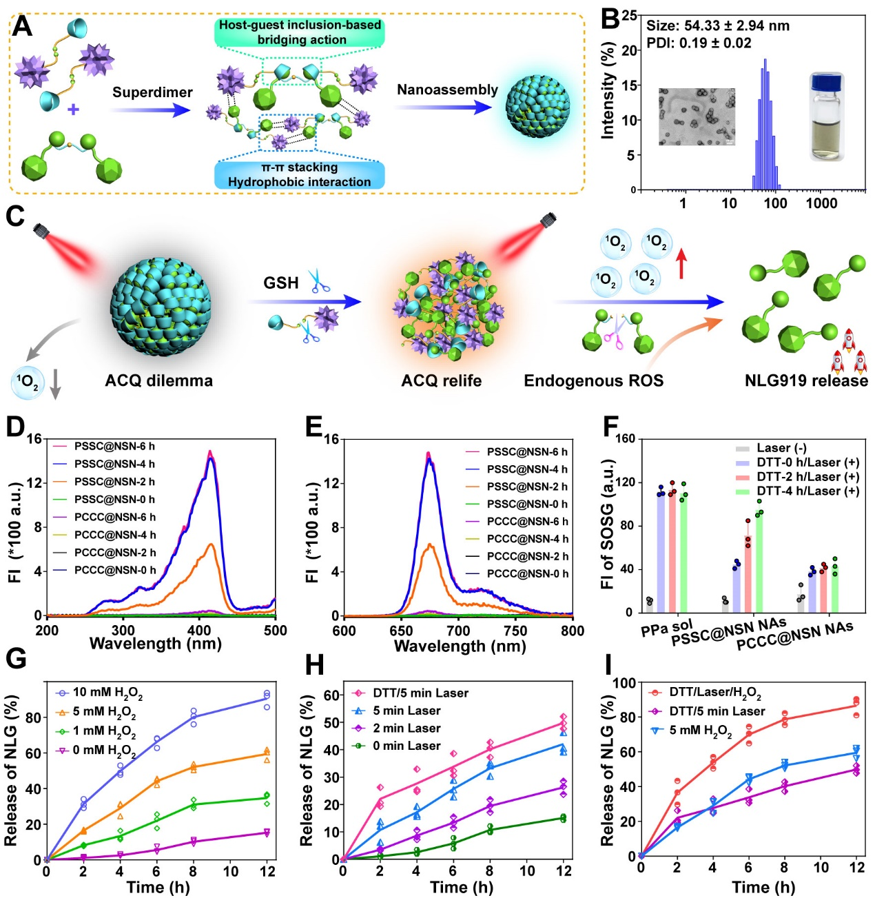 在这项研究中(图1),作者首次发现了一种“超二聚体”驱动的新型纳米组装模式并构建了一种具有时空自适应级联释药特性的超分子纳米组装体,用于高效共递送光敏剂PPa与IDO抑制剂NLG919,并进一步与PD-L1抗体进行联用,以激活免疫反应并同时逆转免疫抑制微环境,从而增强肿瘤的光动-免疫治疗效果。合成了单硫键桥连的IDO抑制剂NLG919同源二聚体前药(NLG-S-NLG, NSN)与二硫键桥连的环糊精(CD)-PPa偶联物(PPa-SS-CD, PSSC),首次发现了两分子PSSC与一分子NSN可以形成一种“超二聚体”结构,具有良好的纳米组装特性,基于此构建了一种新型的超分子纳米组装体(PSSC@NSN NAs)。值得注意的是,CD的引入不仅可以通过主-客体包合作用精确地驱动超分子纳米组装,而且还可以在没有PEG聚合物修饰的情况下赋予纳米组装亲水性表面,实现稳定组装与递送。在肿瘤细胞中高GSH存在时,PSSC中的二硫键作为触发纳米组装解体的“一级开关”,有效缓解PPa的聚集诱导淬灭(ACQ)效应并促进1O2的产生和ICD的诱导效果。PPa产生的1O2和肿瘤细胞中高内源性ROS协同开启NSN中的单硫键“二级开关”,促进NLG919的快速释放。因此,超分子纳米组装体通过“两级开关”的引入可以级联实现ACQ缓解、ICD诱导、NLG919释放和IDO抑制,在两种荷瘤小鼠模型中均表现出良好的抗肿瘤效果,并与PD-L1抗体联合展现出协同治疗作用。