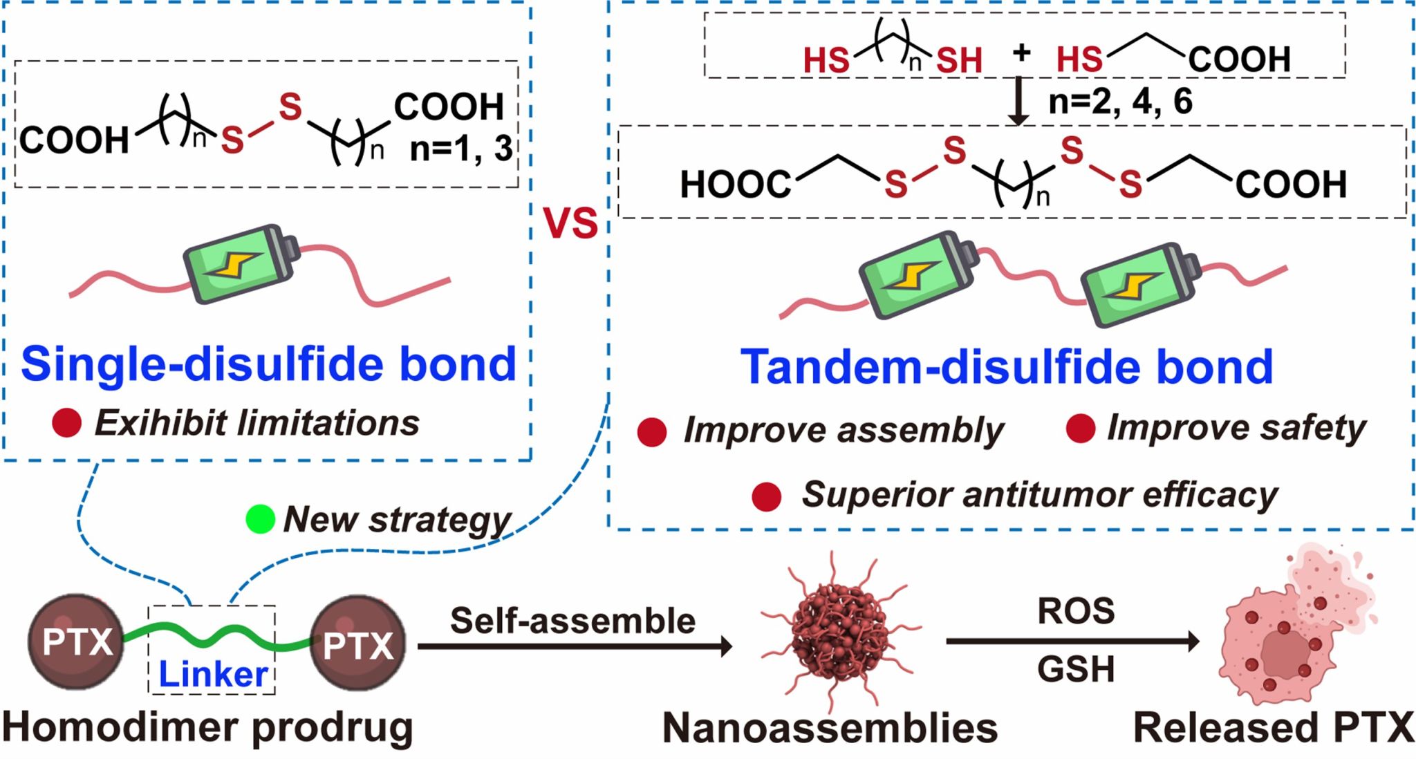 近日,欧冠官网药剂学科孙进科研团队在化学领域国际权威期刊J. Am. Chem. Soc.(IF:14.4)发表了碳原子间隔的“串联型”双二硫键桥连同二聚体前药纳米组装体的最新研究进展,题目为:”Carbon-spaced tandem-disulfide bond bridge design addresses limitations of homodimer prodrug nanoassemblies: Enhancing both stability and activatability”。