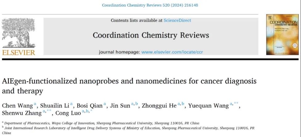 近日,欧冠联赛官网罗聪教授课题组在期刊 Coordination Chemistry Reviews(IF = 20.3)上发表综述文献:AIEgen-functionalized Nanoprobes and Nanomedicines for Cancer Diagnosis and Therapy。欧冠联赛官网罗聪教授、张申武教授、王悦全博士后为本文通讯作者,2022级博士生王晨为本文第一作者。