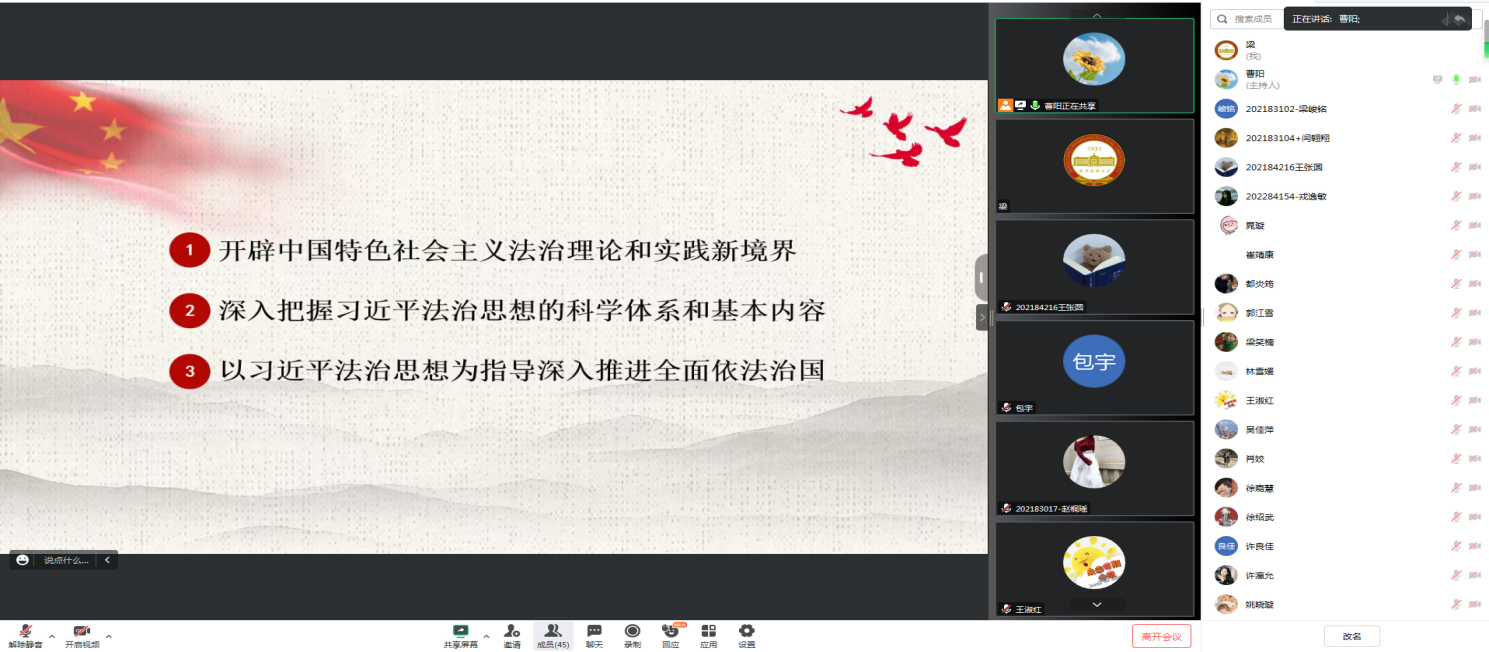 首先,党委组织员曹阳从开辟中国特色社会主义法治理论和实践新境界、深入把握习近平法治思想的科学体系和基本内容、以习近平法治思想为指导深入推进全面依法治国三个方面详细领学了习近平法治思想。她强调,党的十八大以来,习近平总书记以马克思主义政治家、思想家、战略家的非凡理论勇气、卓越政治智慧、强烈使命担当,在领导全面依法治国、建设法治中国的伟大实践中,创造性提出了一系列具有原创性、标志性的全面依法治国新理念新思想新战略,形成了习近平法治思想。习近平法治思想是马克思主义法治理论中国化的最新成果,是中国特色社会主义法治理论的重大创新发展,是习近平新时代中国特色社会主义思想的重要组成部分,是新时代全面依法治国必须长期坚持的指导思想。