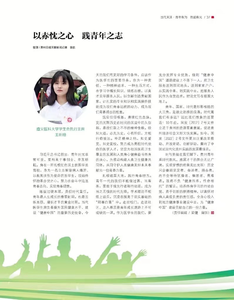 时与势就在我们脚下,贵州青年乘时代新风,施展才干的舞台无比广阔,实现梦想的前景无比光明!历史只会眷顾坚定者、奋进者、搏击者,而不会等待犹豫者、懈怠者、畏难者。我将不负“健康所系,性命相托”的誓言,培养终身学习的行动自觉、勇于创新的拼搏精神,以满怀对病人高度负责的责任感,全身心投入到地方健康事业建设中去,为“健康中国”建设贡献自己的一份力量。(信息来源:当代贵州-20,栏目:当代关注:青年有为 热爱有光,作者:袁航,编辑: 梁健、屠琪)