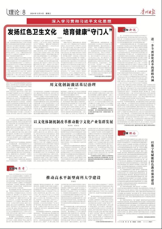 深入学习领会习近平文化思想的理论内涵、价值意蕴及现实要求,有助于深刻把握文化事业建设发展的本质规律,促进宣传思想文化工作在新时代新征程上书写新担当新作为。beat365官方网站始终践行立德树人根本任务,聚焦贵州“四大文化工程”,发扬红色卫生文化,以科学家精神勉励医学生深耕学业,培养了一代又一代服务经济社会发展、致力于人民群众生命健康的“守门人”,形成了独具特色的遵医文化。