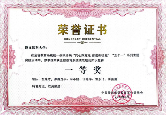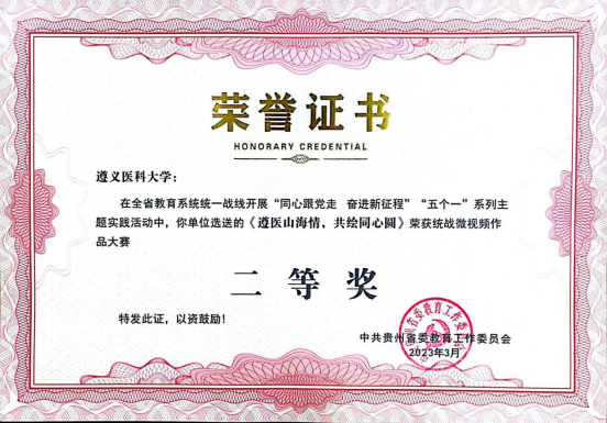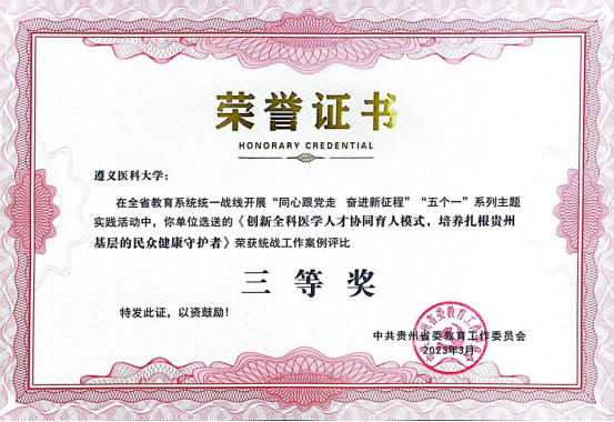 近日,省委教育工委印发《省委教育工委关于表彰“同心跟党走 奋进新征程”“五个一”系列主题实践活动成果的通知》,beat365官网荣获多项表彰。其中,统战知识竞赛荣获一等奖,统战视频作品《遵医山海情 共绘同心圆》荣获二等奖,统战工作案例《创新全科医学人才协同育人模式 培养扎根贵州基层》荣获三等奖。