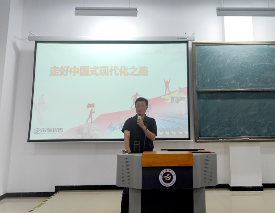 蔡善君以《走好中国式现代化之路》为题,从“继续奋斗·追求千年梦想”“立足国情·开辟全新道路”“凝心聚力·推进复兴伟业”三个方面进行讲解,为同学们介绍了国家现代化三步走的目标和每一次党代会设立的新目标,强调了我国要实现的现代化是人口规模巨大的现代化、全体人民共同富裕的现代化、物质文明相协调的现代化、人与自然和谐共生的现代化、走和平道路发展的现代化。蔡善君讲述了推进复兴伟业需要怎么做,让同学们对走好中国式现代化之路有了更深刻的了解。最后,蔡善君以“中国的现代化建设为什么不能走西方国家现代化的老路”和“谈谈你对中国式现代化本质要求的理解”两个问题结束了课程。