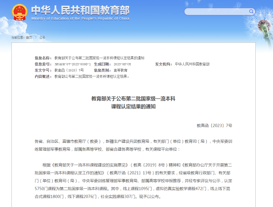 近日,教育部印发《教育部关于公布第二批国家级一流本科课程认定结果的通知》(教高函〔2023〕7号)正式公布第二批国家级一流本科课程认定结果。beat365官网3门课程获得认定,其中虚拟仿真实验教学一流课程1门,线下一流课程1门,线上线下混合式一流课程1门,实现了线上线下混合式一流课程的首次国家级认定。截至目前,学校共获批国家级一流本科课程7门。