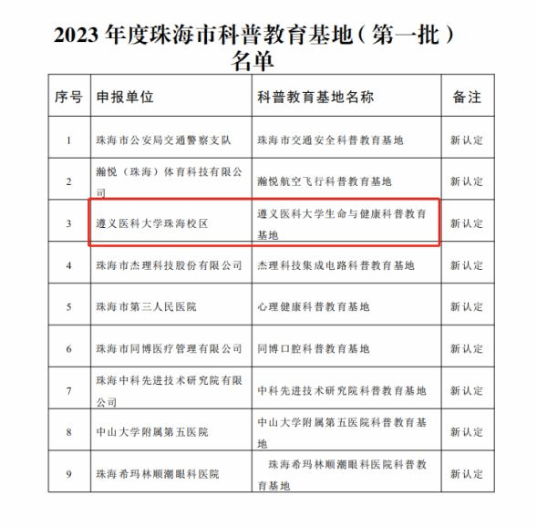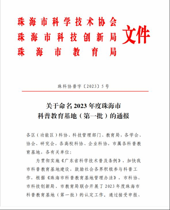根据《珠海市科普教育基地管理办法》,市科协、市科技创新局、市教育局联合开展了2023年度珠海市科普教育基地(第一批)的认定工作。通过接受申报、实地考察、专家评审、认定机关审定等程序,市科协、市科技创新局、市教育局联合命名了9家单位为2023年度珠海市科普教育基地(第一批),其中包括beat365官方网站珠海校区生命与健康科学馆。