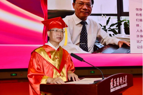 学校党委副书记、校长刘建国代表学校向2023届全体毕业生致以最热烈的祝贺。青春是什么?刘建国从三个方面娓娓道来。青春是短暂的,但却是永远的记忆。他从学校传承红色基因、赓续红色血脉的历史讲起,述说到取得成功更名大学、获批博士学位授予单位等突破性发展的“黄金十年”,他告诉同学们,陪伴母校度过的岁月让你们的青春熠熠生辉,将成为大家弥足珍贵的永恒记忆。青春是匆忙的,但却有持久的感动。多少次为了考试而忐忑不安,多少次因为论文辗转反侧……他说道。如今回看,这些“痛苦时刻”都是为了青春而奋斗的“梦醒时分”。当你们离开母校的时候就可以坚定的说:“无论到哪里,我们永远都是遵医人,因为我们身上传承着遵医魂。”青春是平实的,但却有不屈的坚韧。自习室里的安静阅读,实验室里的反复操作;东湖边的小道上的专心思考,这就是青春真实的一面,所有慎独慎微的背后映射出的是同学们为了学知识、练本领的那份坚韧,在未来人生路上,他绝不会“泯然众人矣”。最后,他勉励同学们,要做胸怀“国之大者”的有志之士。传承和弘扬遵医前辈“红医魂”,为国为民、仁爱济世,要有为党、为国、为民积极奉献的大志向和大气魄。要做心有“德之大者”的有爱之士。从医从教、从研从管,都希望始终以德为先,用“德之大者”来加固人生的底座。要做身有“才之大者”的有识之士。勇于挑最重的“担子”、接最烫的“山芋”、啃最硬的“骨头”,让自己成为可堪大用、能担重任的栋梁之才。