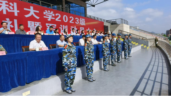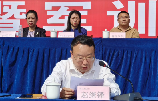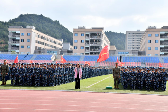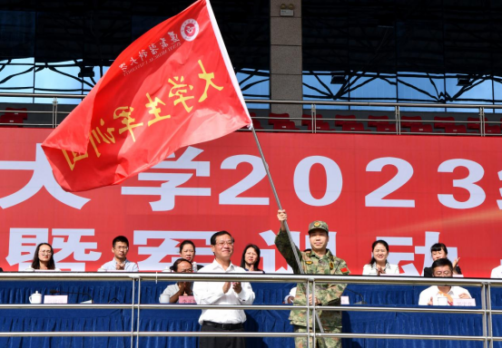 党委委员、副校长赵继锋宣读《beat365官方网站关于2023级大学生军训工作的通知》,党委副书记、校长刘建国为大学生军训团授旗,主席台领导为新生代表佩戴校徽。