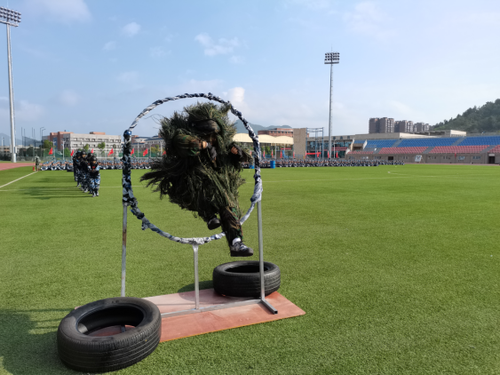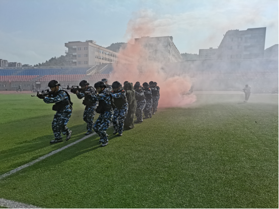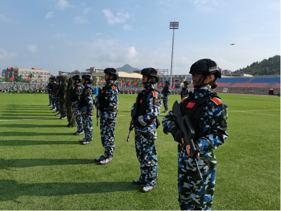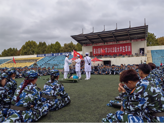 军训成果展示伊始,39名国旗护卫队队员迈着矫健的步伐,精神饱满、铿锵有力地护送着鲜艳的五星红旗走向国旗台。34支方队在军训团团旗方队的带领下,口号嘹亮、步伐整齐的经过主席台,接受检阅,随后学生进行了擒敌拳、刺杀操、匕首操、应急棍、单兵战术等防卫技能和战时防护训练成果展示。他们士气高昂、步伐矫健、动作规范,得到了现场阵阵掌声,充分展现出遵医学子的青春风采和军旅儿女的铮铮铁骨。