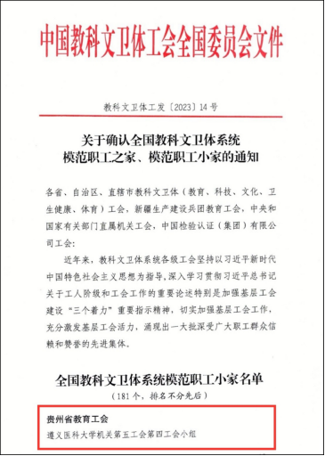 近日,中国教科文卫体工会全国委员会印发了《关于确认全国教科文卫体系统模范职工之家、模范职工小家的通知》(教科文卫体工发〔2023〕14号),beat365官网机关第五工会第四小组学生工作部(处)荣获全国教科文卫体系统“模范职工小家”称号,是贵州省唯一获此殊荣的工会小组。