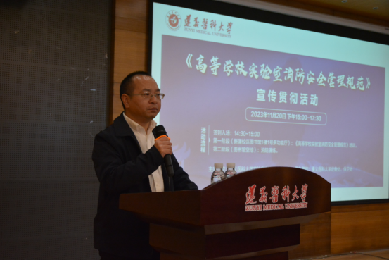 为深入贯彻习近平总书记关于生产安全的系列重要指示批示精神,落实党和国家有关高等学校实验室安全管理工作重要文件精神,强化全校师生实验室消防安全防范意识,为全校师生创造一个安全有序的教学科研环境,11月20日下午,设备处联合保卫处在学校图书馆多功能厅组织开展实验室消防安全管理规范培训及消防演练活动。演练邀请到新蒲新区消防救援大队参谋亲临现场指导,针对实验室消防安全知识和技能进行培训。学校党委委员、副校长龚其海出席,学校实验室安全分管负责同志、二级学院分管领导、职能处室负责同志及实验室安全管理人员、教师、学生等180余人参加,活动由设备处副处长于欢主持。