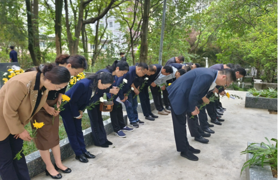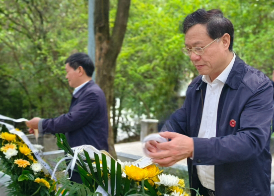 刘建国在墓碑基座前驻足凝视,迈步上前,仔细整理花篮缎带,并和大家一起向陈荣殿教授、伍律教授深深三鞠躬,默哀致意,以表达对陈荣殿教授、伍律教授崇高敬意和无限追思。