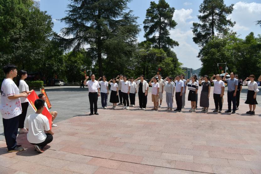 在烈士纪念碑前,由广州医科大学附属第一医院南山学院2名学生代表敬献花篮,刘建国及广州医科大学南山学院教师何少群共同整理挽带。全体师生脱帽肃立、垂首悼念、行礼鞠躬,并向革命先烈们表达深切怀念、致以崇高敬意。随后,学校党委书记、校长刘建国领宣入党誓词,全体师生在声声铿锵有力的宣誓中笃定奋进之力。同时,现场师生排队依序瞻仰了红军烈士纪念碑、邓萍烈士墓等地,师生们在墓碑前列队默哀,表达着对革命烈士的敬意和哀思。