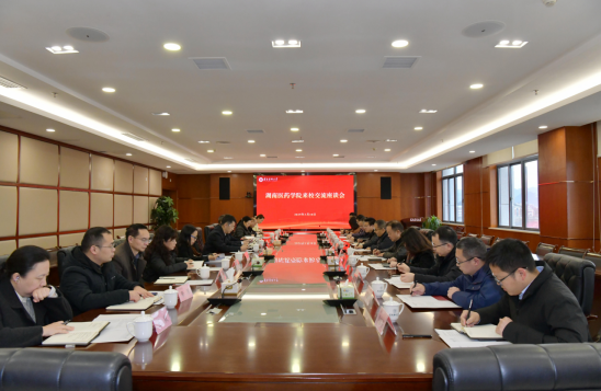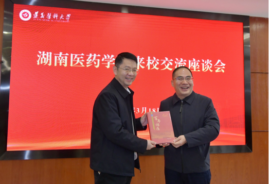 3月18日,湖南医药学院党委书记张在其一行访问beat365官方网站,双方在学校新蒲校区行政楼五楼2号会议室举行交流座谈会。学校党委书记刘文出席并致辞,双方相关职能部门、二级学院负责同志参加。学校党委副书记郭宇亮主持座谈会。