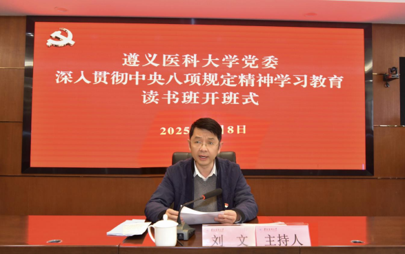 刘文指出,党中央决定在全党开展深入贯彻中央八项规定精神学习教育,这是今年党建工作的重点任务。全校各级干部和党员要深学细悟笃行习近平总书记在贵州考察时的重要讲话精神,要把深入学习贯彻习近平总书记关于加强党的作风建设的重要论述和深入学习贯彻中央八项规定及其实施细则精神结合起来,做到一体学习、一体领会、一体落实,在衷心拥护“两个确立”、忠诚践行“两个维护”上见思想、见行动、见实效,以作风建设新气象展现遵医新风采,走好新时代遵医高质量发展之路。
