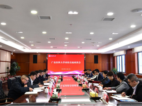 11月13日上午,广东医科大学党委副书记黄达海一行来校交流,并在新蒲校区行政楼五楼2号会议室举行交流座谈会。学校党委副书记郭宇亮致辞。党委组织部、学生工作部(处)、医教协同综合管理处、教务处、人事处、马克思主义学院相关负责人参会。
