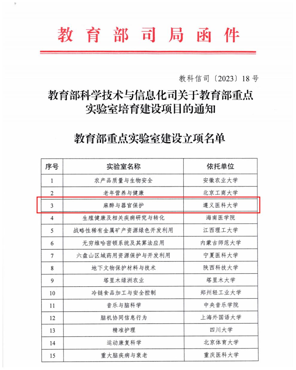 近日,教育部科学技术与信息化司公布了2023年教育部重点实验室培育建设项目立项名单,由beat365官网组建的“麻醉与器官保护教育部重点实验室”获批立项建设。