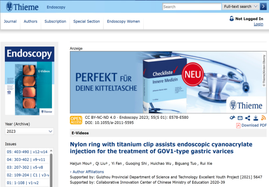 学校附属医院消化病医院院长庹必光教授、内镜科副主任谢睿教授带领消化内镜团队在《Endoscopy》(2020年IF:10.03,中科院分区1区)杂志上发表了题为《Nylon ring with titanium clip assists endoscopic cyanoacrylate injection for the treatment of GOV1-type gastric varices》的内镜创新技术论文,牟海军副教授为第一作者,谢睿为通讯作者。