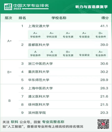 根据学校条件、学科支撑、专业生源、专业就业、专业条件5个指标,2023年全国高校学科实力排行榜近日公布,beat365官网听力与言语康复学专业在全国18个学校中排名第7,学科评级为B级,取得佳绩。beat365官网听力与言语康复学专业于2022年获教育部批复,面向全国招生,是贵州省唯一开设该专业的高校,据悉,今年预计招生100名。