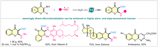 开发新型的反应策略来构筑重要分子,尤其是杂环化合物,一直是药物合成领域的迫切需求,因为该反应模式为药物分子的快速合成和重要药物活性分子的发现提供了新的机遇。色酮是一类优势的含氧杂环骨架,广泛存在于诸多中药民族药的天然产物结构和药物分子中。研究表明,对于含有色酮骨架的分子,其不同取代基与生物活性之间显现出了密切的相关性。因此,发展新型和高效的合成方法来构建结构新颖和多样化的色酮类分子,对深入开展这一领域的化学生物学研究具有重要意义。