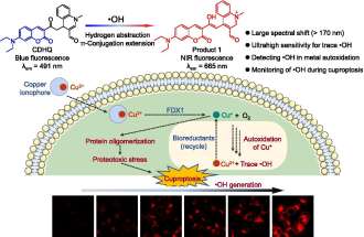 铜死亡是一种最近发现的铜依赖性的细胞死亡调控途径,在许多关键的生理和病理过程中发挥着重要作用。铜死亡的发生主要是源自于细胞内异常富集的过渡金属铜,其可与脂酰化的线粒体酶结合,然后导致蛋白质寡聚化和蛋白质毒性应激,并最终导致细胞死亡。然而,目前尚不清楚在铜死亡发生过程中,与过渡金属代谢密切相关的活性氧物种(ROS),尤其是对生物分子具有强烈破坏性作用的羟基自由基(·OH)水平是如何变化的,并是否参与了铜死亡的最终执行。袁泽利教授团队与中国科学院化学研究所马会民研究员团队基于此原因,合作研发超灵敏的近红外荧光探针(CDHQ),以用于铜死亡过程中·OH水平变化的实时原位成像监测研究。(审核:一审袁泽利、二审杨清玉、三审李均,撰稿:李洪玉)