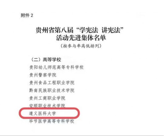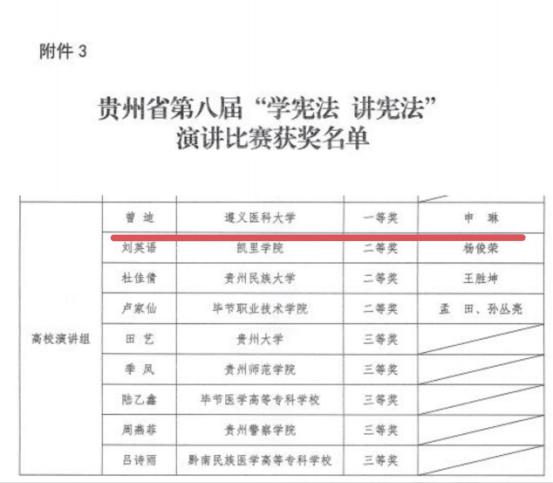 近日,省教育厅通报表扬了贵州省第八届学生“学宪法 讲宪法”活动先进集体和先进个人。beat365官网荣获先进集体,beat365官网第一临床学院2021级学生曾迪(指导老师:申琳)荣获高校演讲组一等奖。
