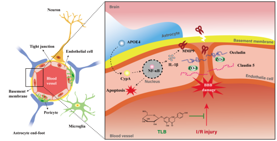 缺血性脑卒中是全球范围内高发病率、高致残率、高致死率的重大疾病。目前,缺血性脑卒中最有效的临床治疗策略是及时恢复缺血区域的血液灌注。然而,脑组织缺血区域血流恢复灌注后,导致损伤进一步加重,这种血流再循环引起的继发性损伤称为脑缺血-再灌注损伤。血脑屏障(blood-brain barrier,BBB)是指脑毛细血管内皮细胞、周细胞与神经胶质细胞伪足共同形成的血液与脑细胞之间的屏障,能够透过营养物质并阻止血液中的有害物质进入大脑。脑缺血-再灌注损伤可导致BBB功能紊乱,因此,如何保护BBB是防治脑缺血-再灌注损伤的关键。