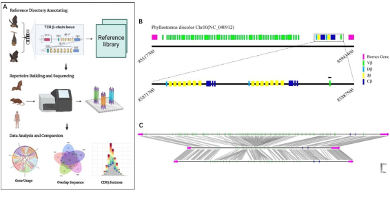 beat365官网姚新生团队基于马铁菊头蝠、苍白矛吻蝠、伏翼的TRB-VDJC胚系基因注释,生成了蝙蝠TRB胚系基因参考数据库,初步构建出用于分析不同种类蝙蝠TCR CDR3组库,建立了初步试用于蝙蝠TRB-VDJC分析的MiXCR分析工具平台。通过杭州艾沐蒽公司完成的中菊头蝠样本制备、5’RACE法进行TCR beta chain CDR3组库的建库、ImmuHub®技术平台二代测序,获取原始的下机数据(数据已在公共平台共享),从VDJ的取用、CDR3区的长度和AA组成、CDR3 motif、CDR3的多样性和克隆性、CDR3区核苷酸的插入和缺失等特征,根据团队多年在人和小鼠TCR CDR3组库研究中的积累,首次对比阐述了蝙蝠TRB CDR3组库的基本特征,为开展蝙蝠T细胞抗病毒、抗肿瘤的特异应答或耐受机制,提供了全新的解决方案。