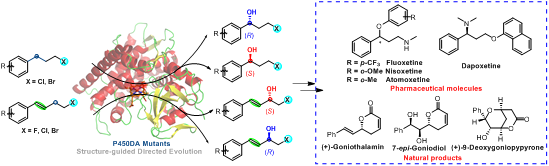 手性γ-卤代醇和β-卤代烯丙醇是合成氟西汀、尼索西汀、托莫西汀和达泊西汀等药物和天然活性分子的关键中间体,而卤代烃的C–H键直接区域、化学和立体选择性羟基化是合成卤代醇化合物的一种有挑战性的合成策略。课题组基于P450DA-M3的X射线晶体结构,通过结构导向的定向进化方法,构建了系列P450DA突变体。能以区域、化学和对映选择性控制卤代烃的苄位和烯丙位C–H键羟基化反应,并获得对映选择性互补的手性γ-卤代醇和β-卤代烯丙醇产物,而分子中的卤素原子和C=C键未反应。该方法提供了一种通用且温和的策略,从含有多能团的底物出发通过不对称羟基化反应合成高附加值的化合物,这是其它催化剂通过C−H键羟基化反应难以实现的。