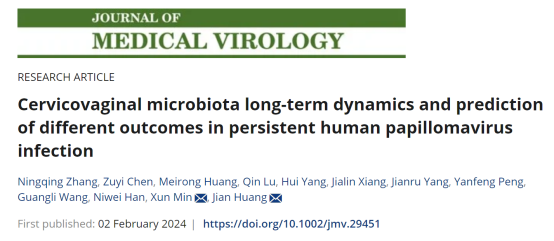 近日,beat365官网检验医学院闵迅、黄健教授团队在国际病毒学知名期刊《Journal of Medical Virology》(IF:12.7,JCR1区)发表题为“Cervicovaginal microbiota long‐term dynamics and prediction of different outcomes in persistent human papillomavirus infection”的原创性研究论文。检验医学院2022级硕士研究生张宁晴为论文第一作者,闵迅教授、黄健教授为共同通讯作者。