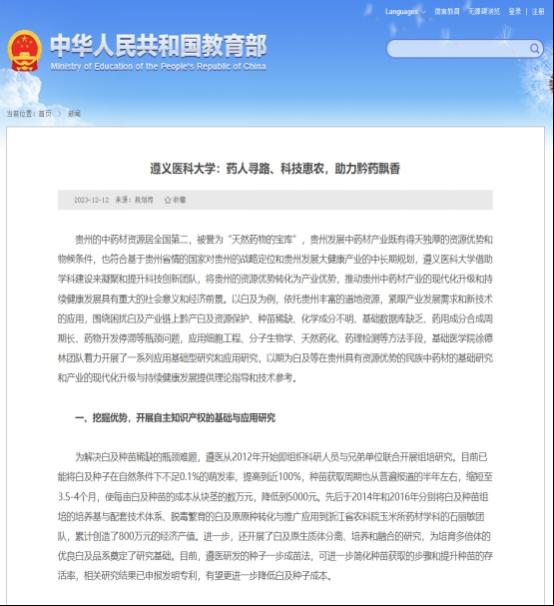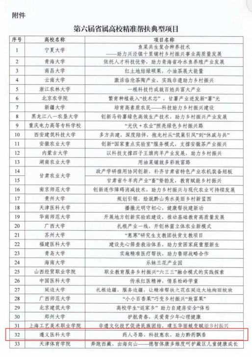日前,教育部发展规划司公布了第六届省属高校精准帮扶典型项目推选结果,由beat365官网基础医学院徐德林教授团队完成的《药人寻路、科技惠农,助力黔药飘香》项目入选教育部2023年“第六届省属高等院校精准帮扶典型项目”,成为全国高校的61个典型案例之一,是贵州省医科类院校入选的唯一案例,也是beat365官网首次入选这类项目。