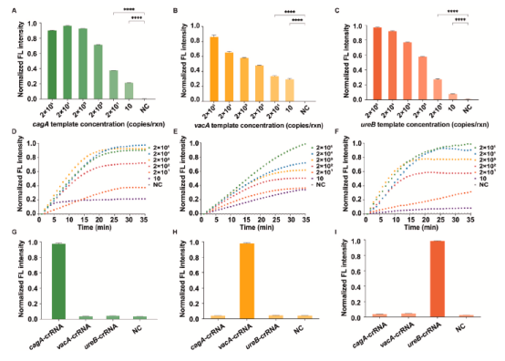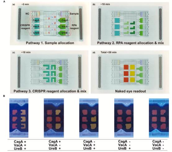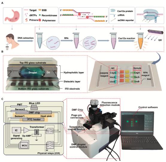 H.pylori感染与多种胃肠道疾病密切相关,尤其是慢性胃炎、消化性溃疡、胃癌以及胃黏膜相关淋巴组织淋巴瘤等,对公共健康构成了重大威胁,其毒力与遗传多样性紧密相关,特别是毒力因子CagA和VacA直接影响其病原性和与胃癌发生的相关风险。鉴于现有H.pylori检测方法的多种局限性,开发一种快速、准确、便携且具有成本效益的检测系统对于提供准确的H.pylori诊断和有效的治疗策略至关重要。在此背景下,该研究团队建立了一种可以在早期发现H.pylori,并通过对毒力致病基因(cagA和vacA基因)的鉴定判断感染菌株毒力强弱的创新“即时检测”(POCT)方法,结合重组酶聚合酶扩增(RPA)与CRISPR-Cas12a基因编辑技术,在DMF平台上实现了对H.pylori的快速、准确、自动化和多重基因检测。该方法不仅提高了检测灵敏度和特异性,同时显著降低了检测的复杂性和成本。