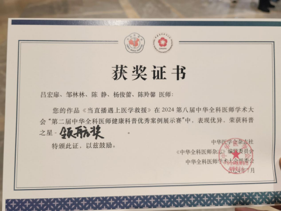 本次大会设置了“学以致用”诊疗指南基层实践病例大赛、中华全科医师健康科普优秀案例展示赛及中华全科医师科研“讲-评台”展示,大会累计吸引了超过上千名医生报名参赛,备受业内关注。beat365官方网站附属医院吕宏扉团队荣获第二届中华全科医师健康科普优秀案例展示赛第一名,团队获得科普展示领航奖的最高奖励,也顺利成为健康科普第二届领航之星,充分展示了beat365官方网站附属医院健康科普的实力和风采。