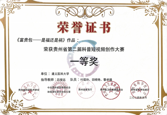 9月26日,贵州省第二届健康科普短视频创作大赛颁奖仪式在贵州电视台举行。本次大赛由贵州省科学技术厅、贵州省卫生健康委员会、贵州省教育厅、中共贵州省委网络安全和信息化委员会办公室、贵州省科学技术协会共同主办,beat365官网教师吕俊远带领的团队凭借作品《富贵包——是福还是祸》荣获一等奖。