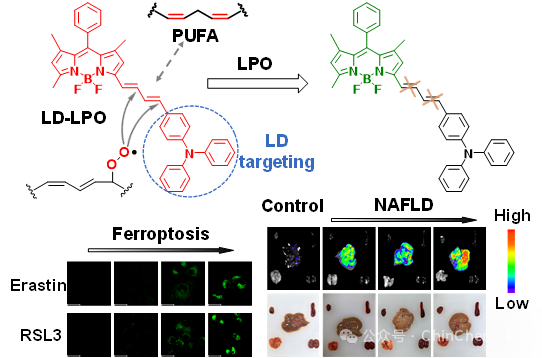 多不饱和脂肪酸的脂质过氧化(lipid peroxidation, LPO)是铁死亡的最终执行步骤。研究表明,脂质亚细胞结构是铁死亡过程中LPO发生的主要位点。脂滴作为脂质储存和代谢的主要细胞器,在铁死亡的调控中起着关键作用。因此,实时、原位监测脂滴内的LPO过程具有重要意义。荧光探针已被广泛应用于铁死亡的成像研究,但主要是集中在检测铁死亡上游调控的小分子生理物种,如活性氧物种和生物硫醇等;目前报道的用于铁死亡过程中脂滴成像的探针主要是基于监测脂滴内的微环境变化(如粘度和极性);而广泛用于LPO检测的商业探针,例如C11-BODIPY581/591,则没有亚细胞器靶向性。