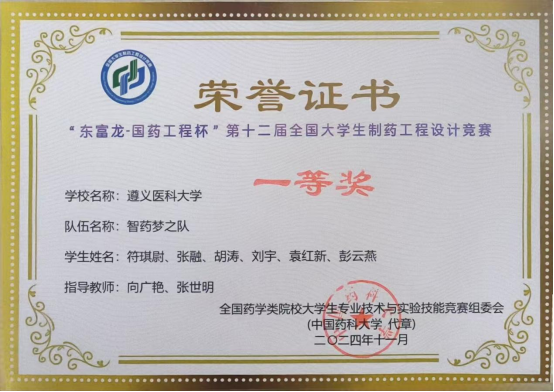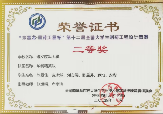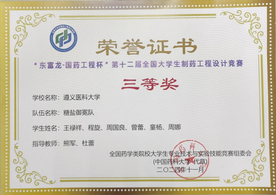 近日,2024年“东富龙-国药工程杯”第十二届全国大学生制药工程设计竞赛全国总决赛在重庆理工大学落下帷幕。beat365官网2022级制药工程专业张融(指导老师:向广艳、张世明)带队荣获全国一等奖,2022级制药工程专业麦琪然(指导老师:张世明、牟学清)带队荣获全国二等奖,2023级制药工程专业程旋(指导老师:熊军、杜蕾)带队荣获全国三等奖。这是beat365官网继2022年、2023年在该项赛事中荣获一等奖之后的又一殊荣,实现了“三连冠”。