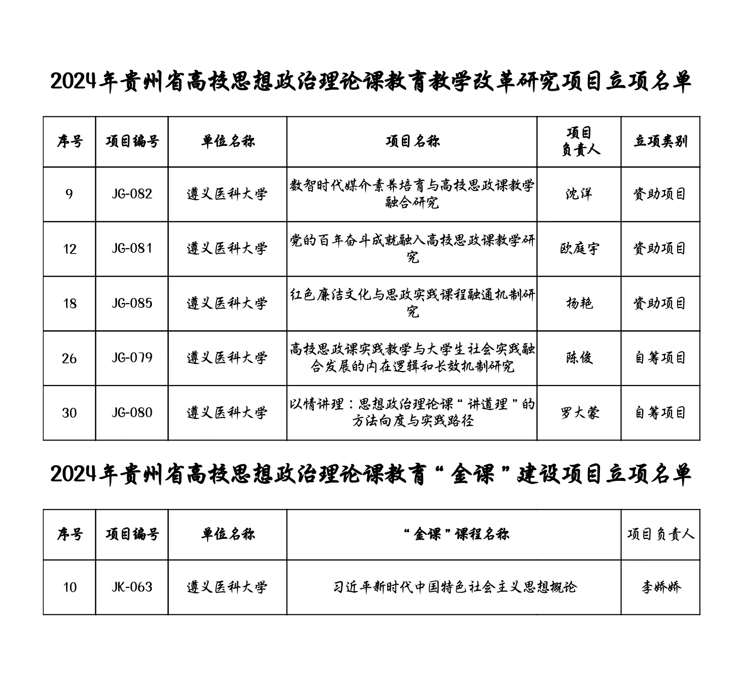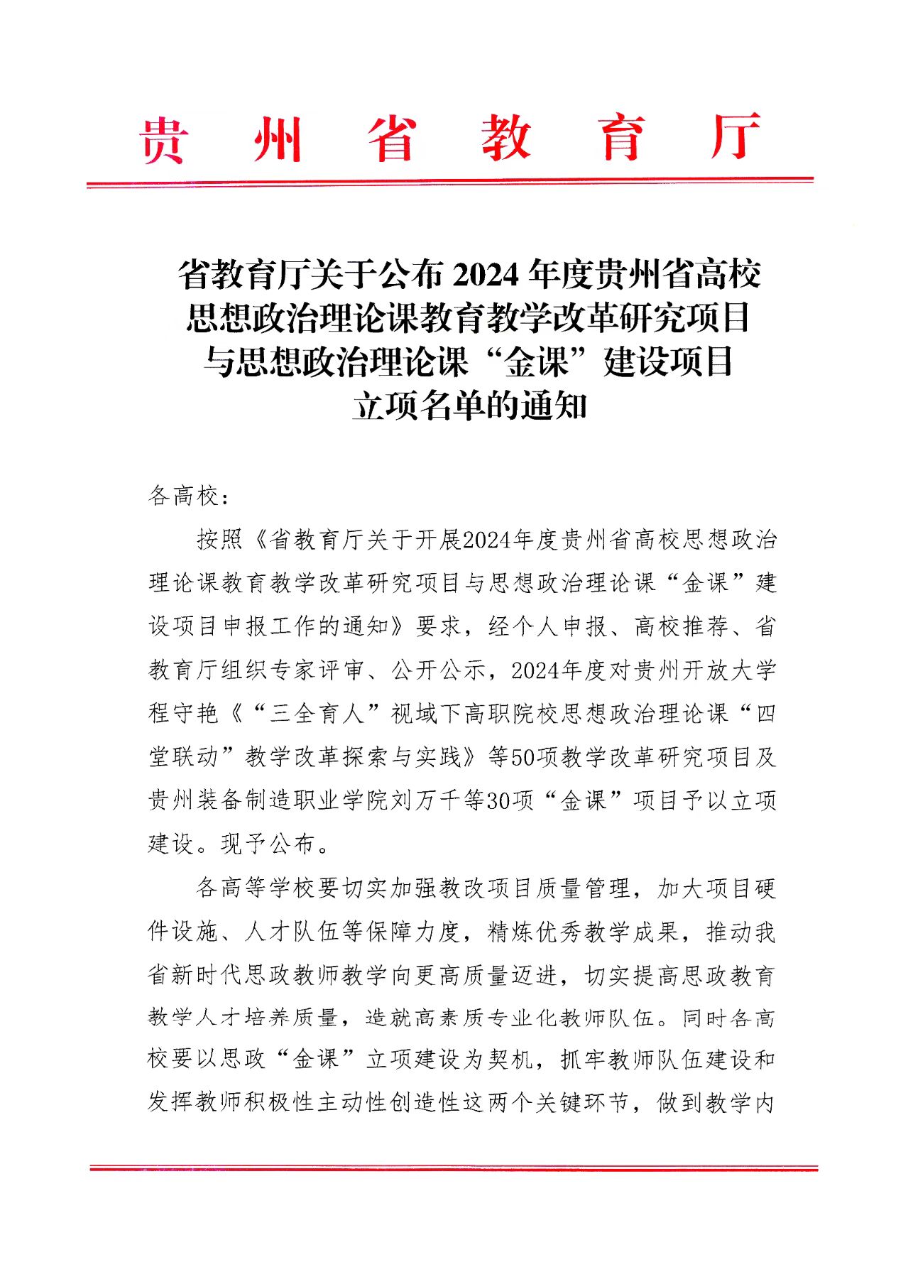 近日,省教育厅正式公布2024年度贵州省高校思想政治理论课教育教学改革研究项目与“金课”建设项目立项名单。beat365官网获批5项思政课教学改革项目(其中资助项目3项)和1项思政课“金课”建设项目。