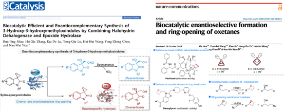 围绕卤醇脱卤酶生物催化制药技术的开发,建立了一种双酶组合生物催化策略,用于对映选择性互补合成手性3-羟基-3-羟甲基氧化吲哚类化合物。硕士研究生缪润萍作为第一作者发表该研究成果,指导老师为万南微教授。通过拓展卤醇脱卤酶的催化功能,成功开发了一种新型生物催化平台,可用于氧杂环丁烷的对映选择性合成和开环,也可用于制备手性氧杂环丁烷及多种手性γ-取代醇化合物。该论文第一作者为制药工程专业硕士研究生华夏,指导老师为万南微教授。
