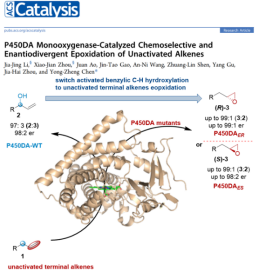 基于单加氧酶P450DA的蛋白晶体结构,通过结构导向的定向进化方法,构建了由碳氢键羟基化功能向碳碳双键环氧化功能转变的P450DA酶突变体,实现了非活性烯烃的高选择性环氧化,并且对映选择性互补合成一系列烷基取代的手性环氧化合物。药物化学专业硕士研究生李嘉靖和博士研究生周晓建作为第一作者发表该研究成果,指导老师为陈永正教授。