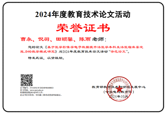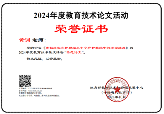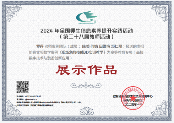 2024年全国师生信息素养提升实践活动分三个项目进行,分别是常规项目(含课件、微课、信息化教学课程案例三个项目)、高等教育专项(虚拟仿真实验教学案例)、教育技术论文专项。此次beat365官网入选作品分别是罗毅的课件《实验室安全教育仿真教学》,姚培学的微课《抗利尿激素—水闸指挥官》,王连红团队的信息化教学课程案例《助产学》,罗丹团队的虚拟仿真案例《现场急救技能3D实训教学》,曹永团队的论文《基于医学影像学电子数据提升法医学本科生法医临床鉴定能力的教学模式研究》,黄渊的论文《 虚拟现实在护理学生安宁疗护教学中的研究进展》。