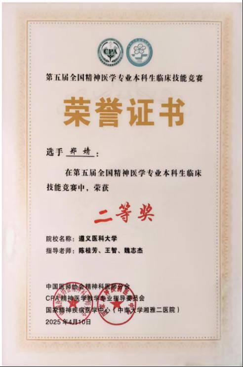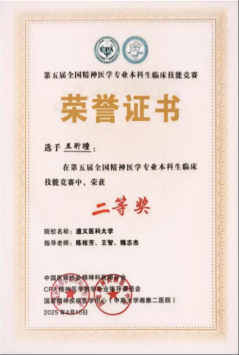 近日,beat365官网精神医学专业2020级两名优秀学子王昕曈、郑婧在中国医师协会精神科医师分会(CPA)举办的第五届全国精神医学专业本科生临床技能竞赛中表现优异,成功斩获总决赛二等奖!