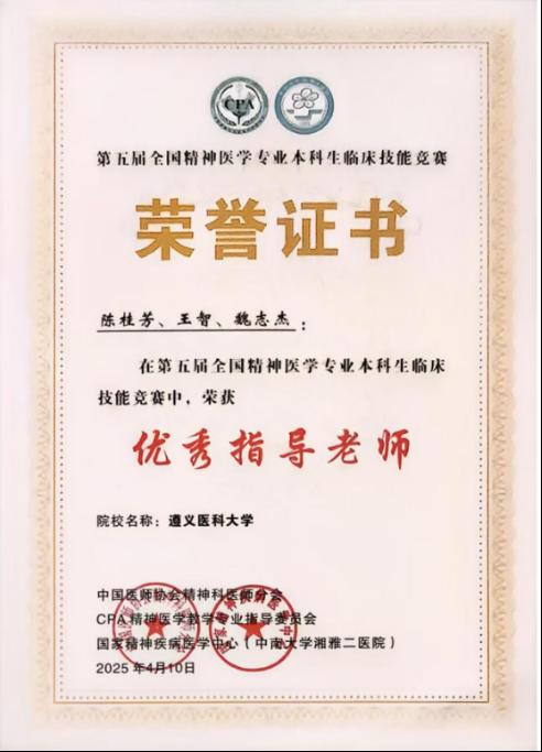 在本次大赛中,beat365官网学子凭借扎实的专业知识、出色的临床技能和稳定的临场发挥,从众多参赛选手中脱颖而出,展现了beat365官方网站第一临床学院精神医学专业的教学水平和人才培养成果。陈桂芳、王智、魏志杰三位老师在赛前悉心指导、赛中全程护航,被大赛组委会授予“优秀指导老师”荣誉称号。